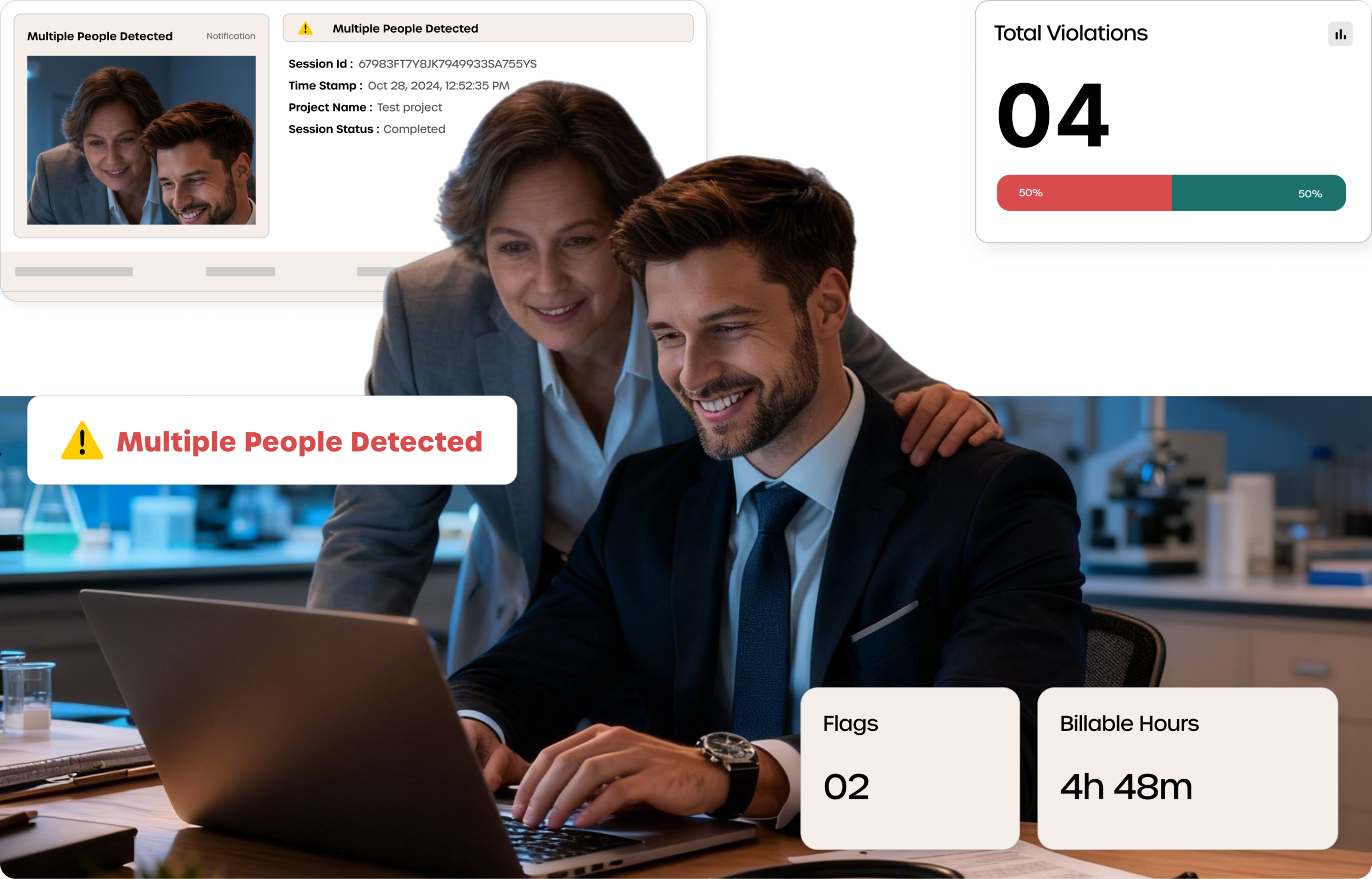 Violation detection occurs locally. We do not store facial images, biometric templates, or continuous video feeds on our servers.